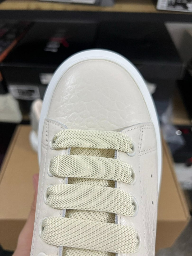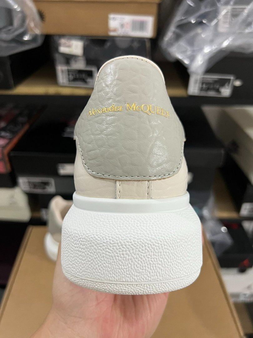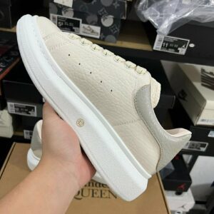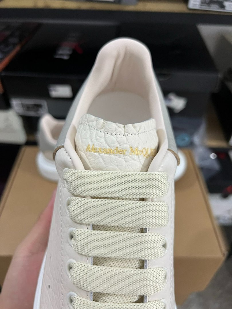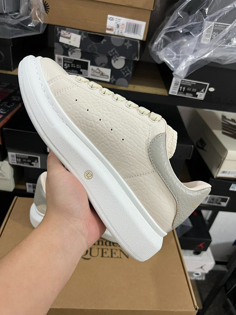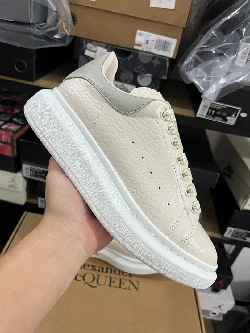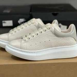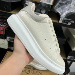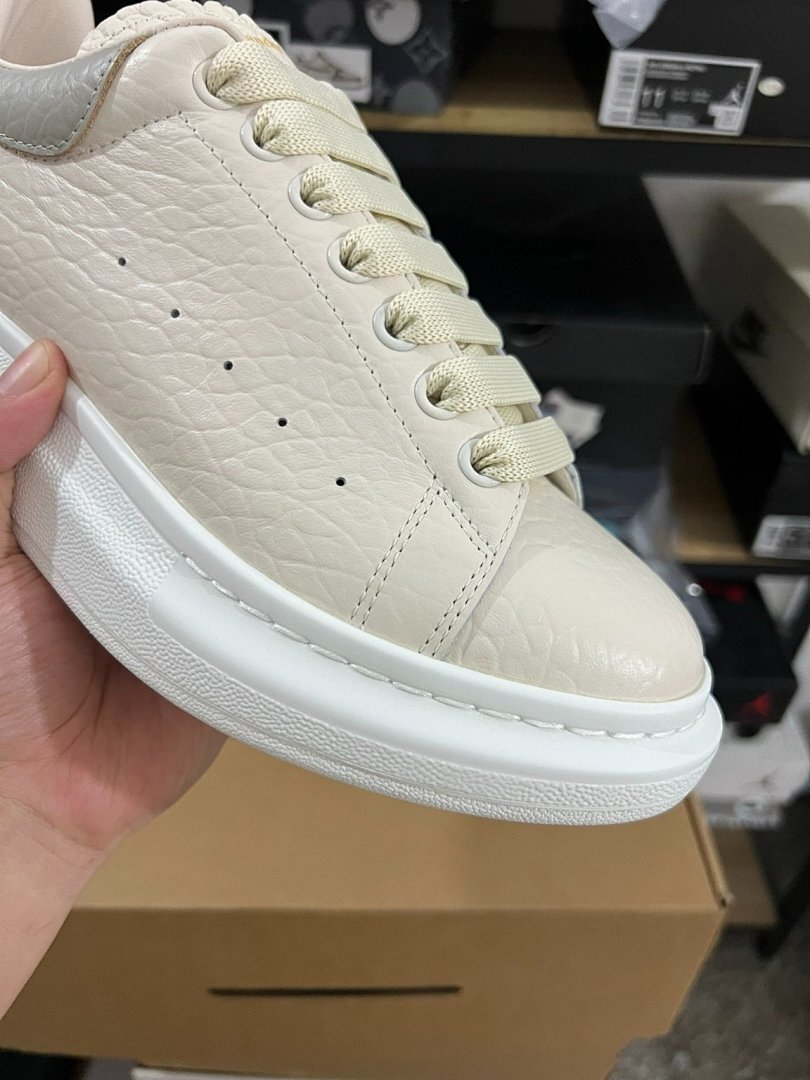 Elevate Your Style: Alexander McQueen Oversized Sneaker Cream Ivory Pebbled Leather Grey Heel Tab White Sole Luxury Designer Platform Trainers