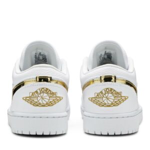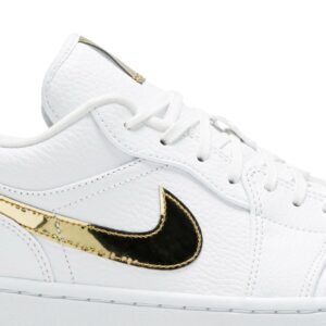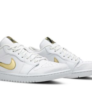 The Air Jordan 1 Retro Low White Metallic Gold (WMNS) by Jordan is a stylish sneaker designed specifically for women. Featuring a white and metallic gold colorway, these shoes are perfect for adding a touch of elegance to any outfit. Step out in style with this iconic design that combines classic elements with a modern twist.