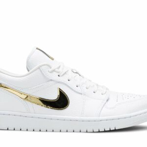 The Air Jordan 1 Retro Low White Metallic Gold (WMNS) by Jordan is a stylish sneaker designed specifically for women. Featuring a white and metallic gold colorway, these shoes are perfect for adding a touch of elegance to any outfit. Step out in style with this iconic design that combines classic elements with a modern twist.